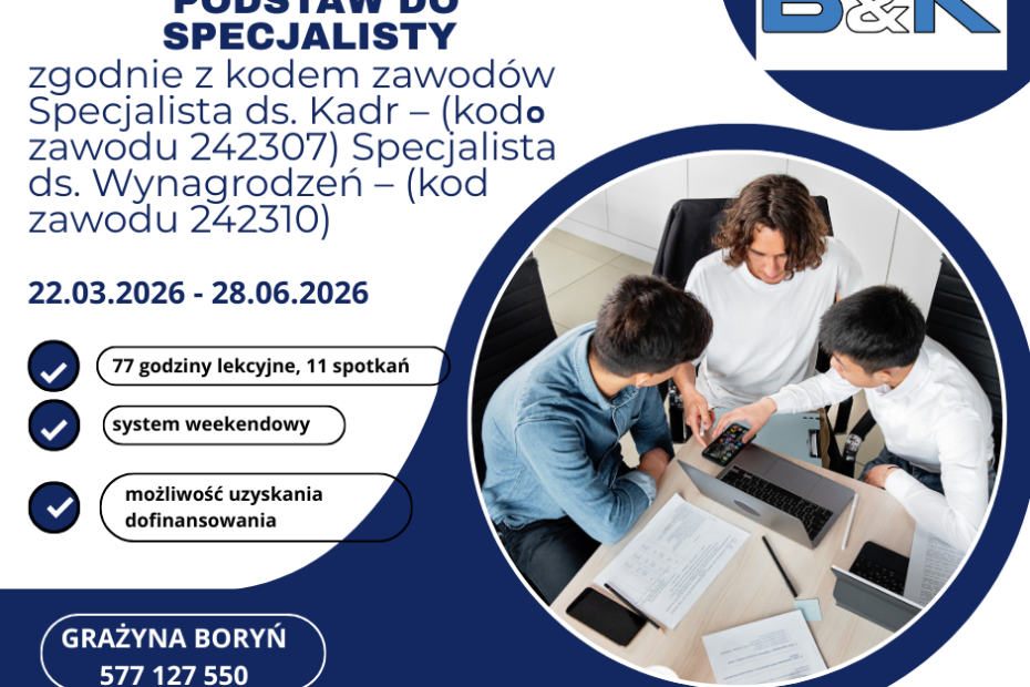KURS KADRY I PŁACE OD PODSTAW DO SPECJALISTY zgodnie z kodem zawodów Specjalista ds. Kadr – (kod zawodu 242307) Specjalista ds. Wynagrodzeń – (kod zawodu 242310)