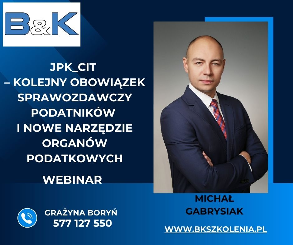szkolenie zdalneCelem szkolenia jest: przygotowanie uczestników do prawidłowego sporządzania i weryfikacji Jednolitego Pliku Kontrolnego dla podatku CIT (JPK CIT), zgodnie z obowiązującymi przepisami prawa podatkowego i rachunkowego. Szkolenie ma na celu wyjaśnienie zasad poprawnego przygotowania ksiąg rachunkowych, identyfikacji błędów oraz zapewnienia zgodności dokumentacji z wymogami urzędów skarbowych.
